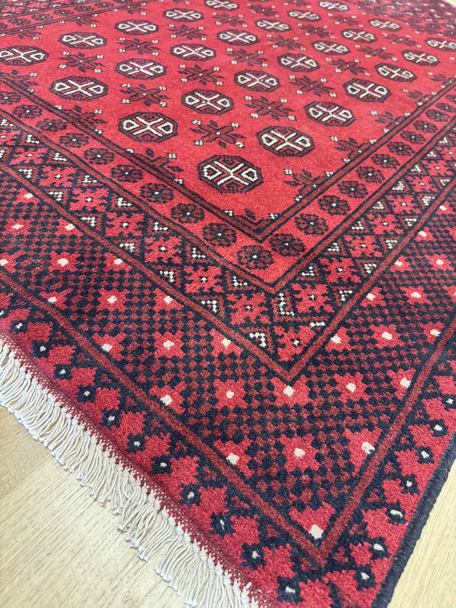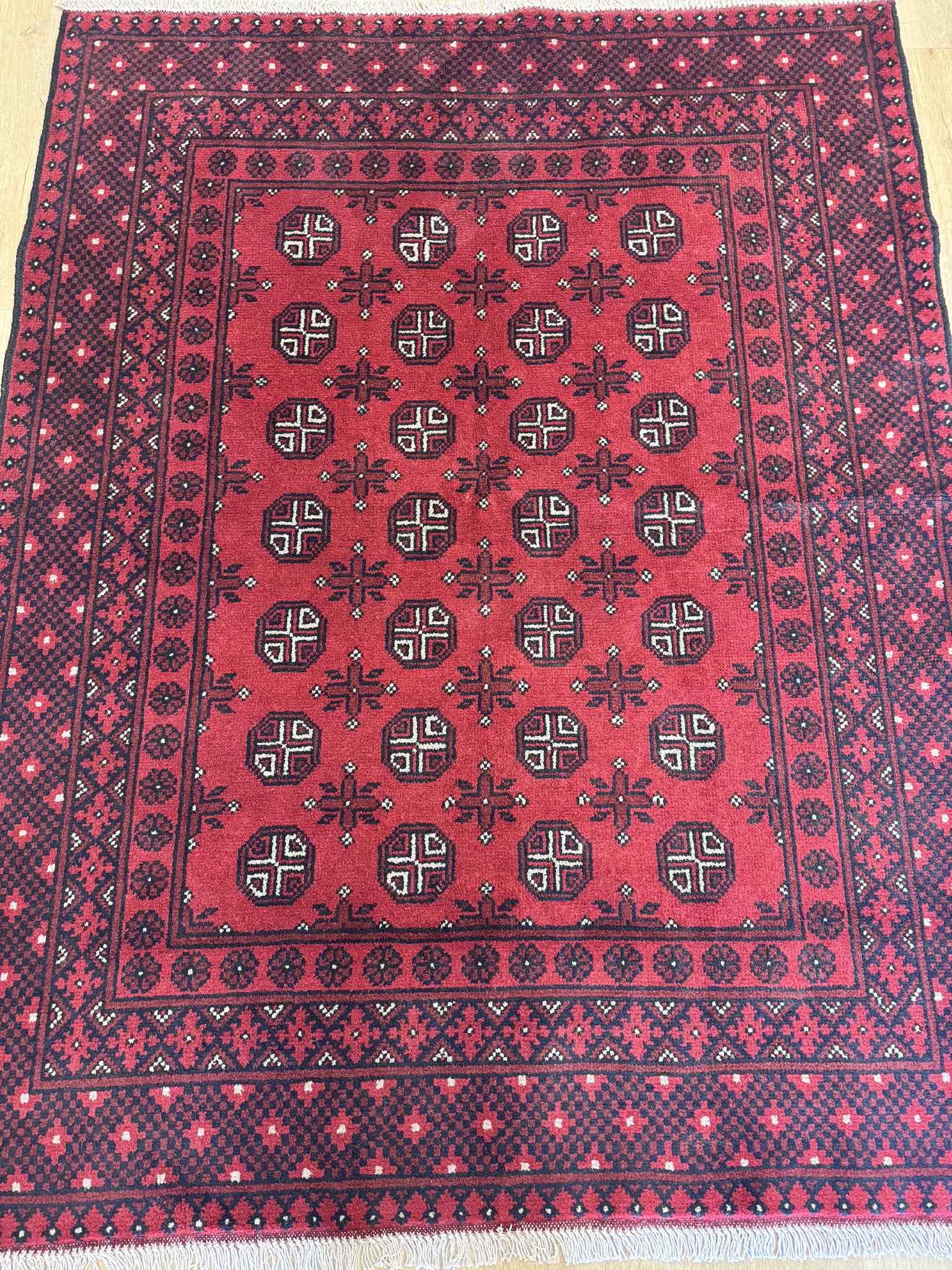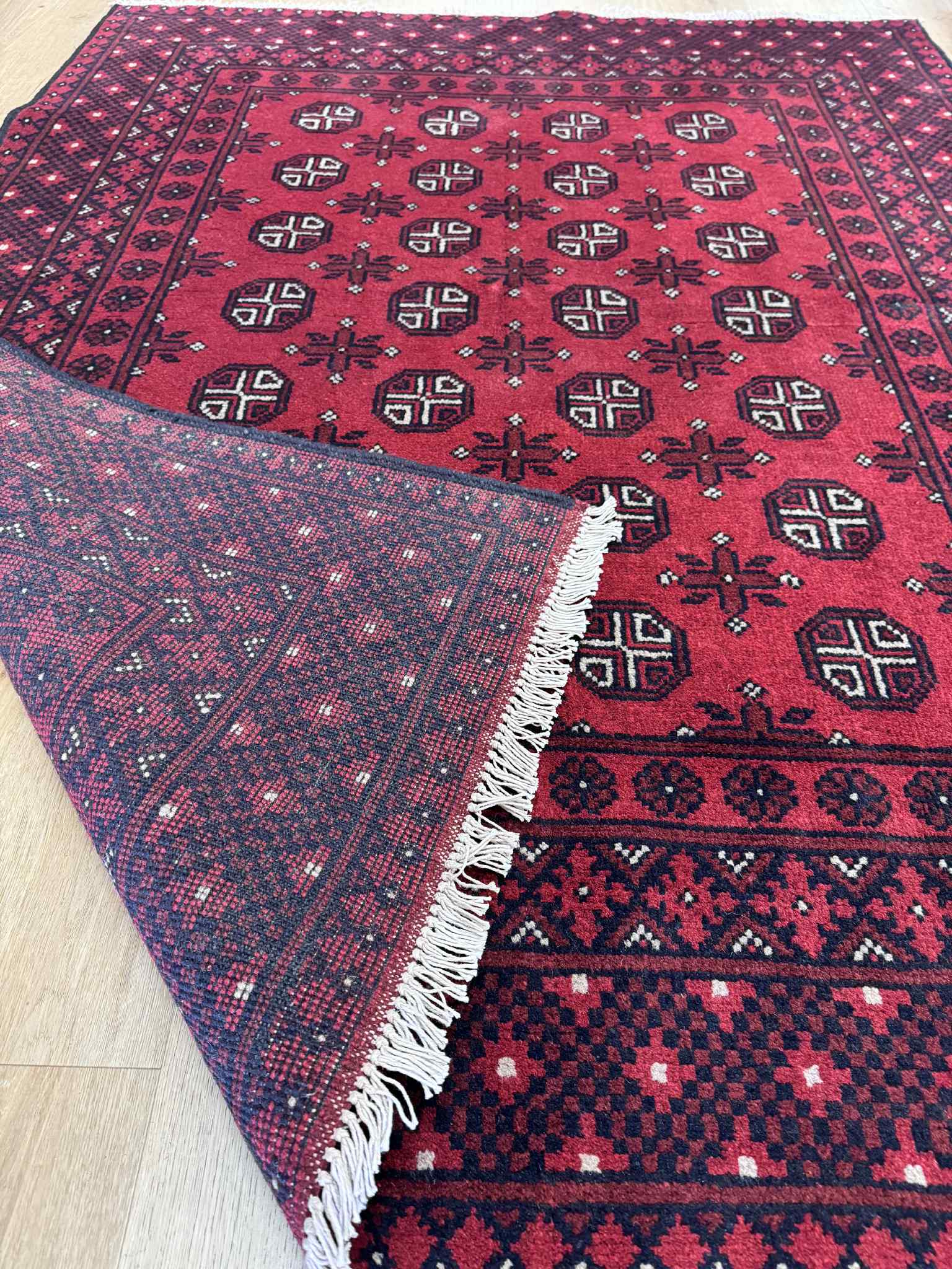 Hand-knotted in Aqcha, Afghanistan, this tribal rug embodies the bold symmetry and geometric precision of Afghan weaving. Its repeat medallion layout features octagonal guls arranged in a structured grid, surrounded by smaller motifs resembling stars or crosses, all set against a deep crimson field.