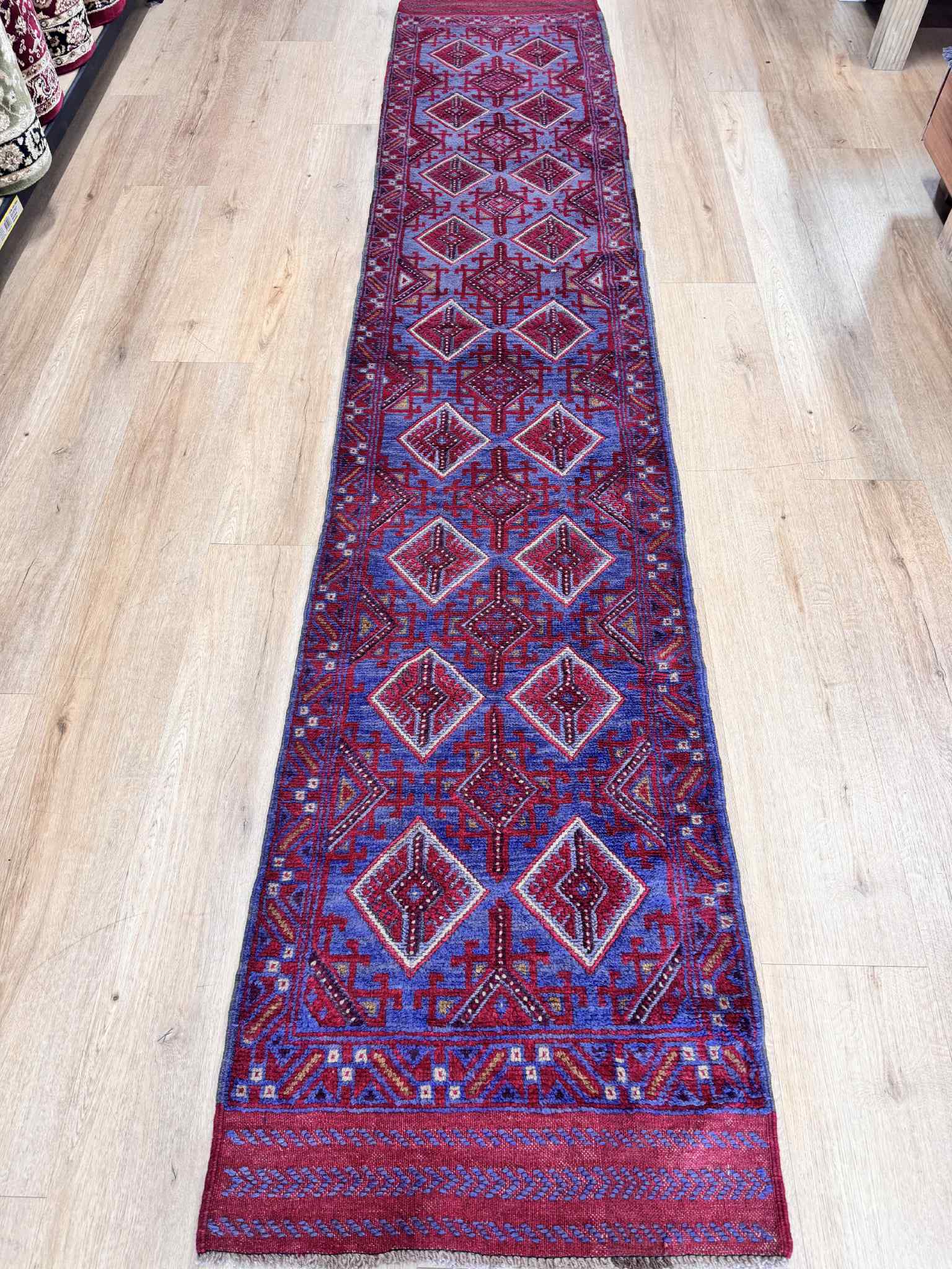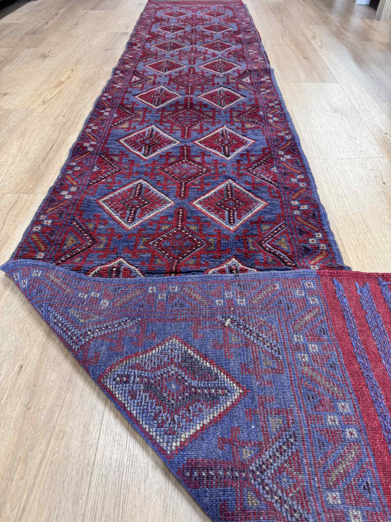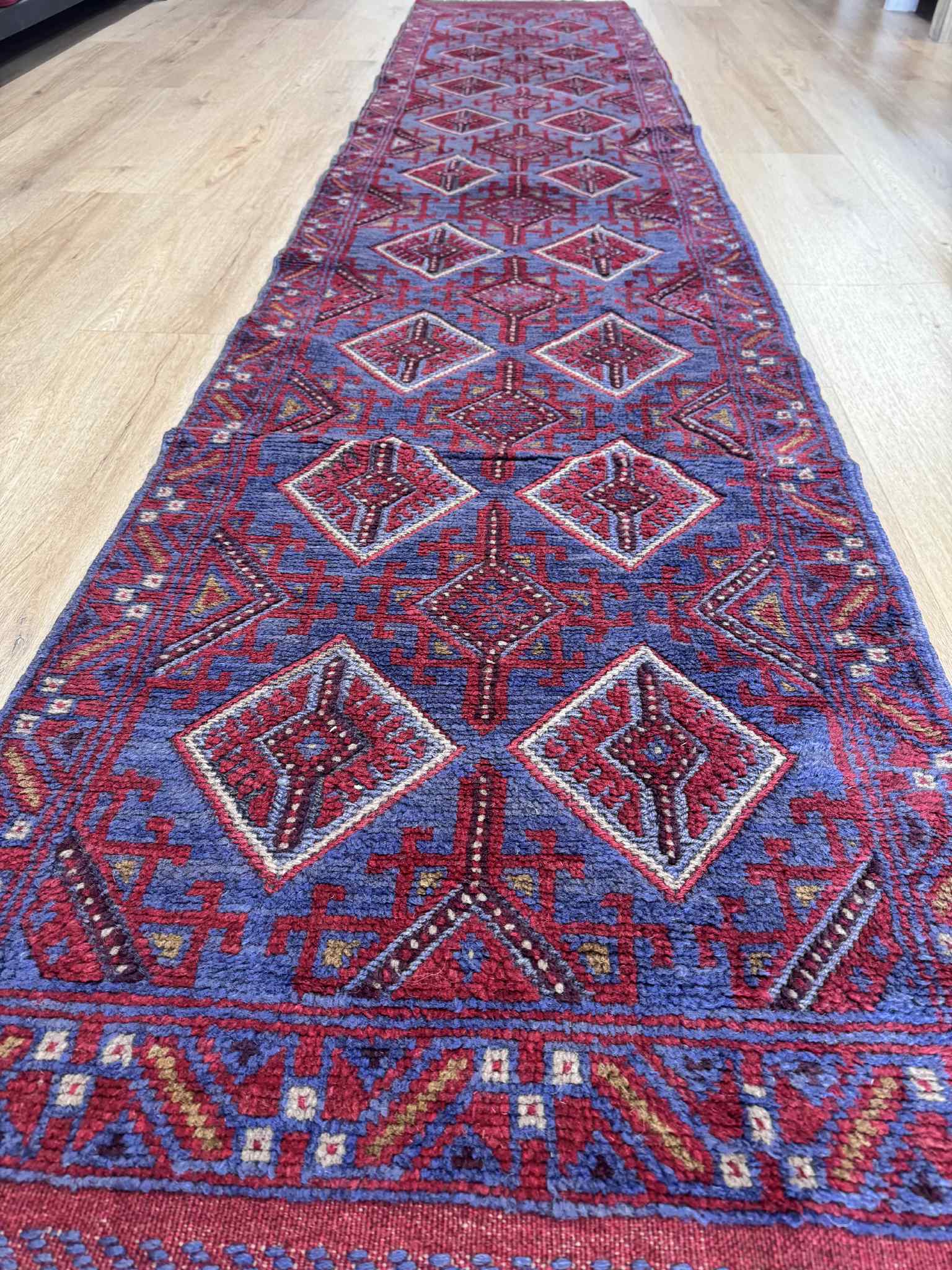 Afghan Hand knotted pure wool Persian Baluchi Hall runner, measuring 345×68cm