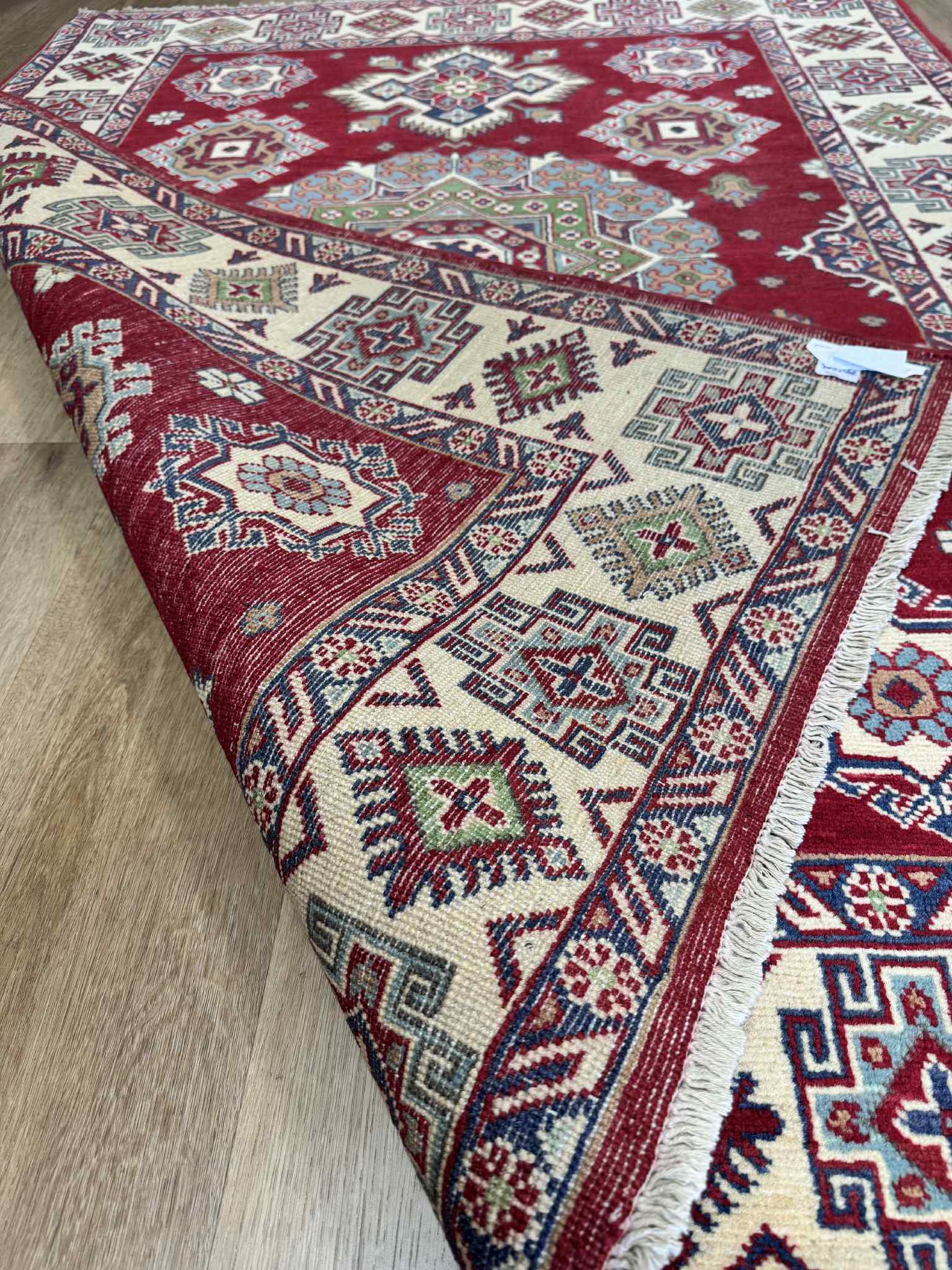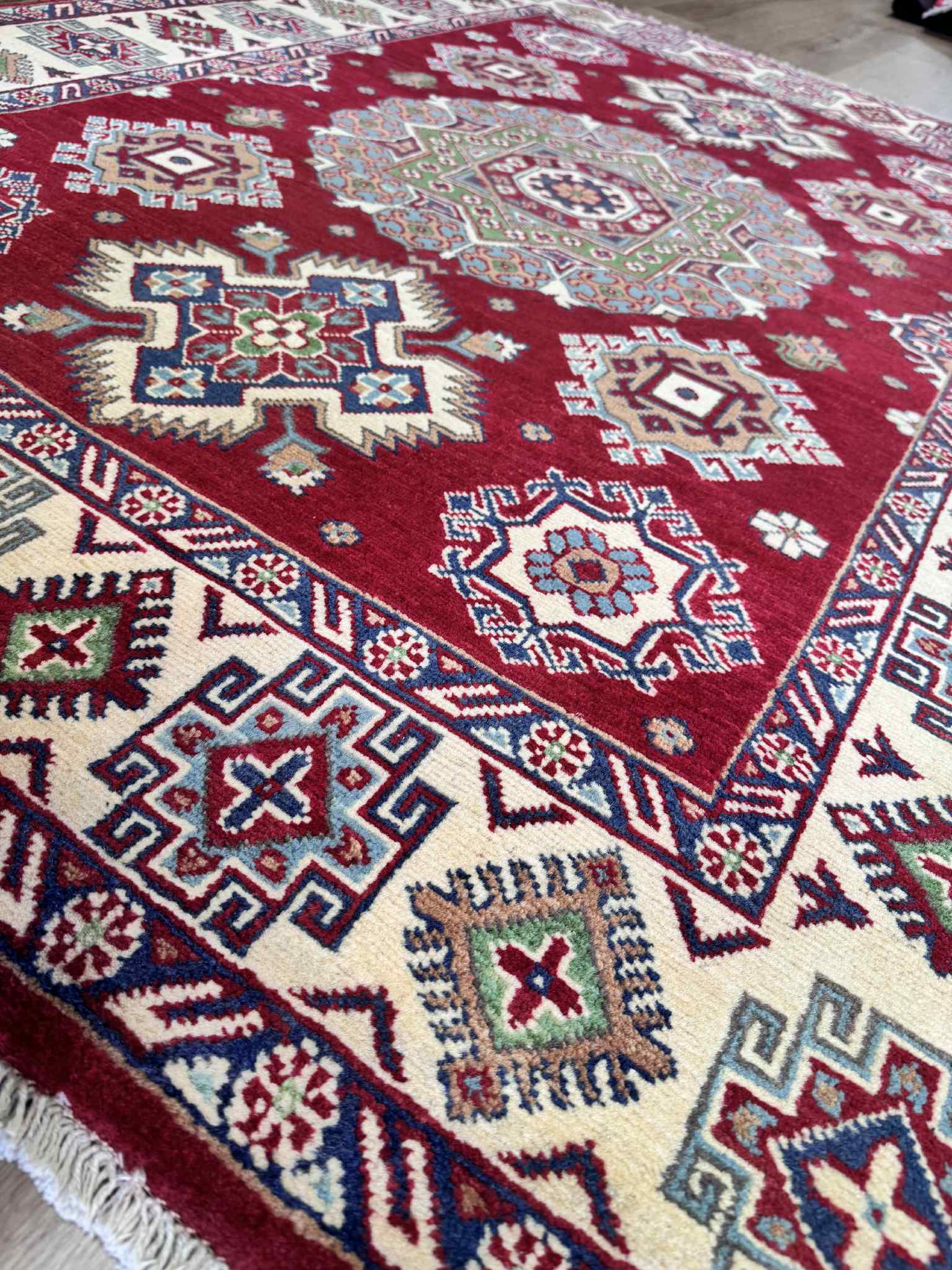 Handmade in Kabul, Afghanistan, this Kazak rug is one the newest styles available in our Kazak collection. Made from the finest wool and incredible woven craftsmanship, this rug is truly handmade to last.