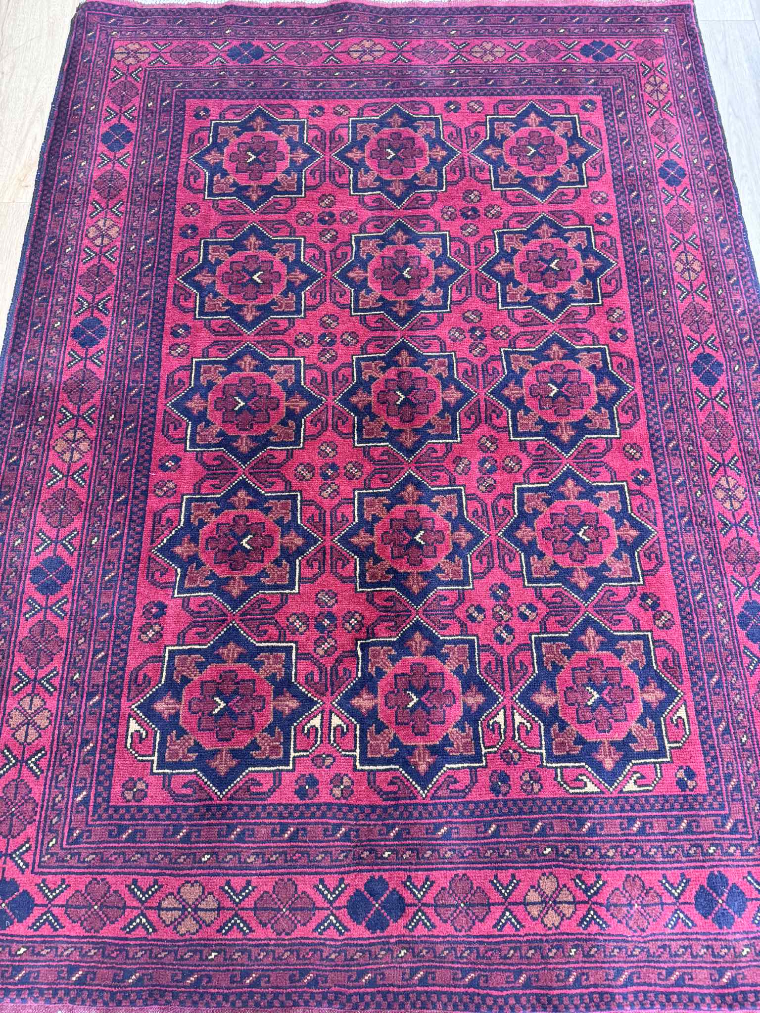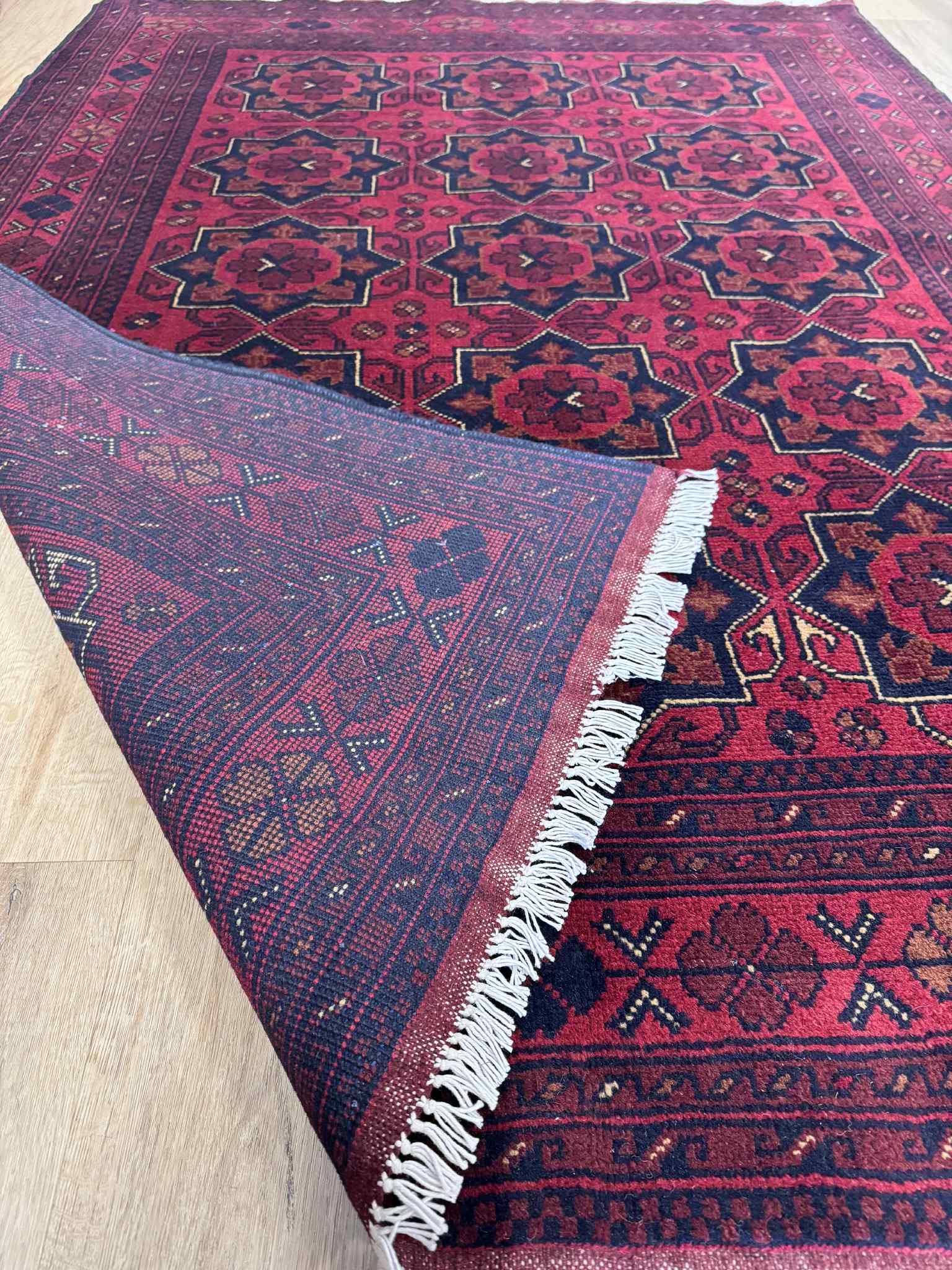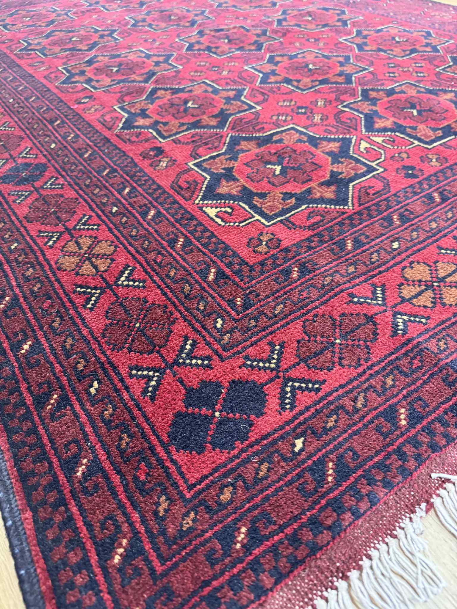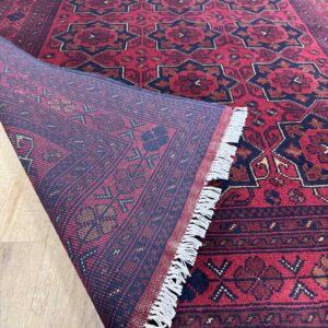 Khal Mohammadi rugs, a timeless classic Afghan rug hand knotted in Faryab district of Northern Afghanistan. This unique combination of rich colors, complimented by perfect ratio of geometric patterns was first founded during 1970s by the legendry rug master Mr. Khal Mohammad. Made from 100% wool often deep red is used as base color in Khal Mohammadi rugs, obtained from natural root dyes.