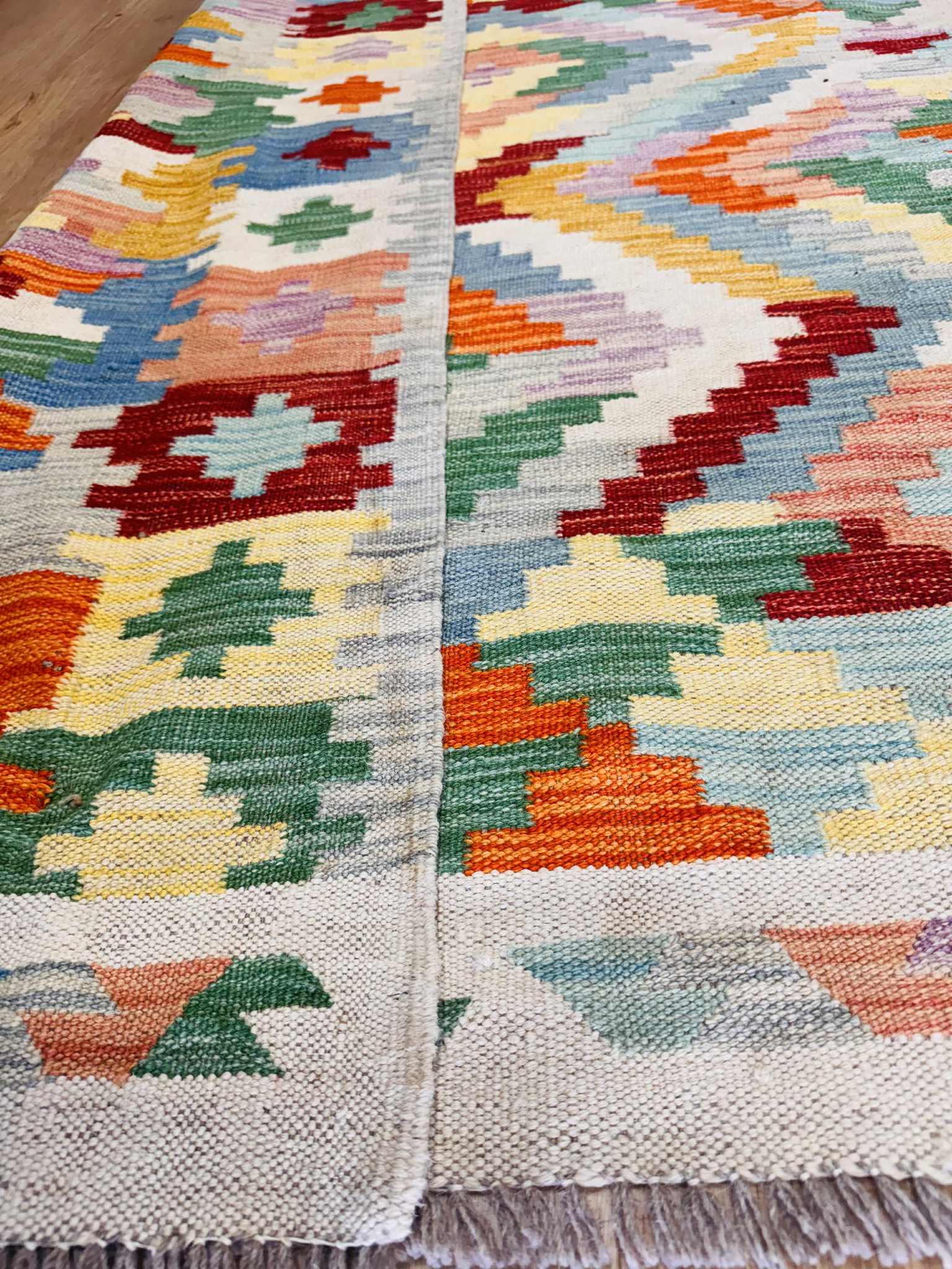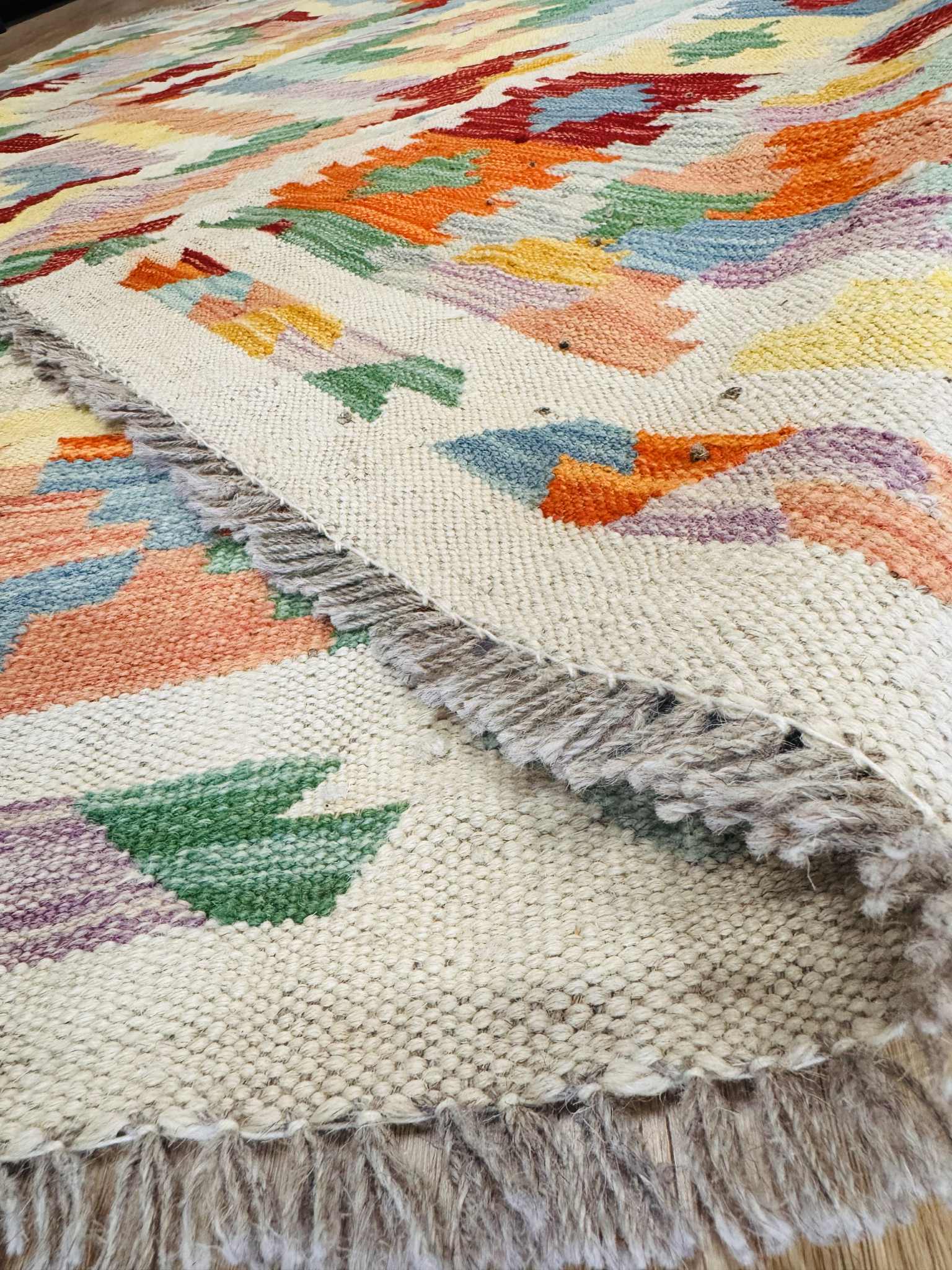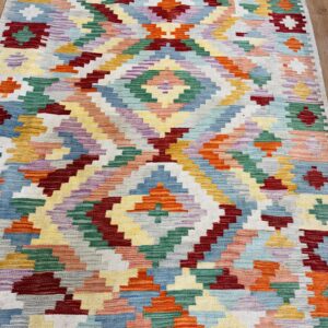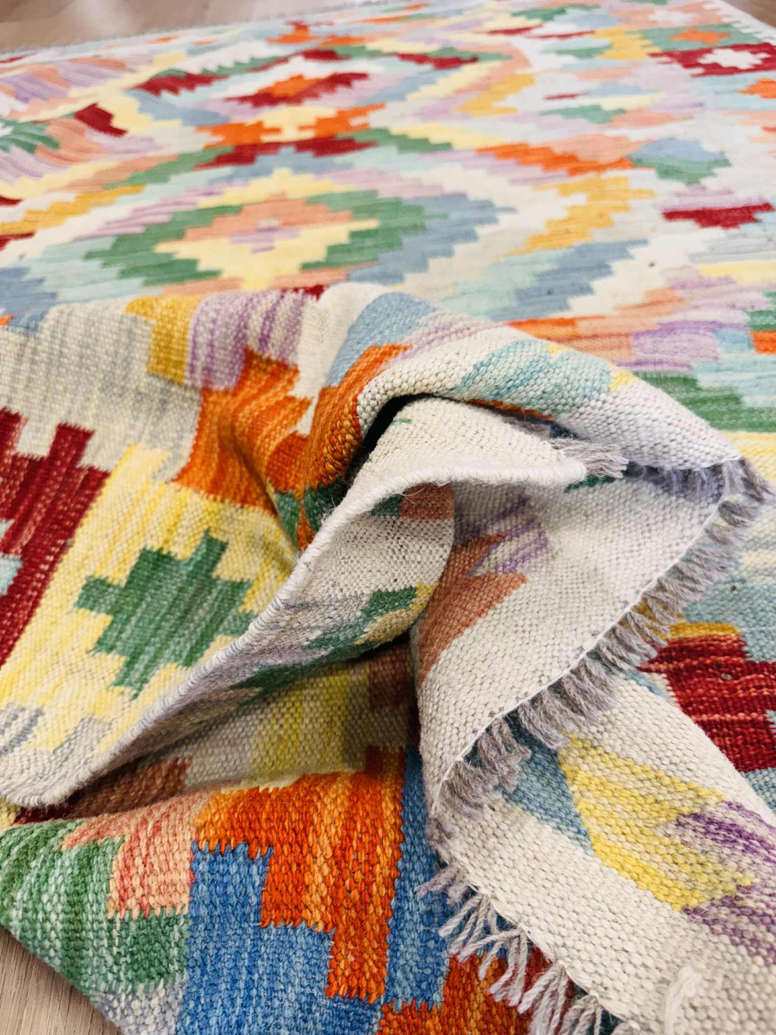 This vibrant Afghan handmade Kilim rug exemplifies the finest traditional craftsmanship. Handwoven from high-quality wool, it offers a durable and textured finish. The Kilim rug features an intricate design with a lively palette of multi-colour hues, blending bold patterns with striking tones. Perfect for adding a touch of cultural richness and unique style to any space, this rug not only enhances your décor but also embodies the rich artistic heritage of Afghan weavers.