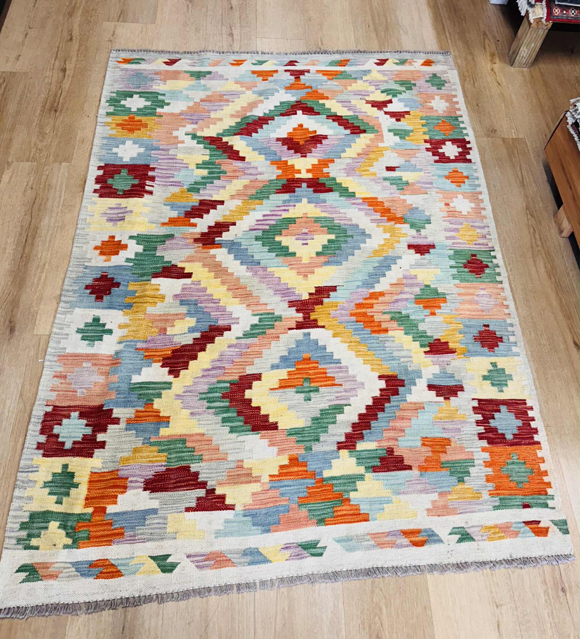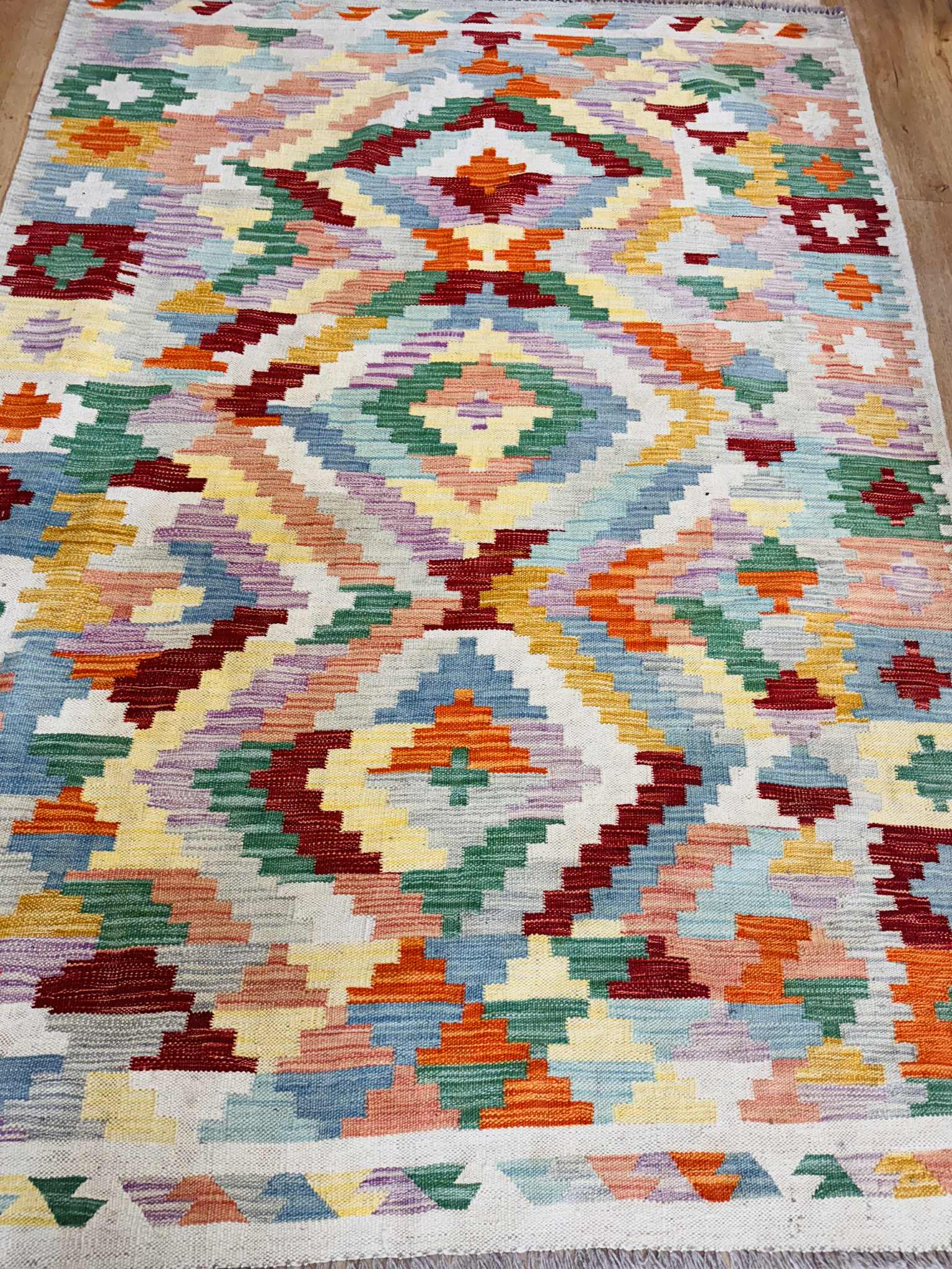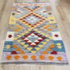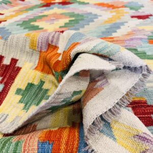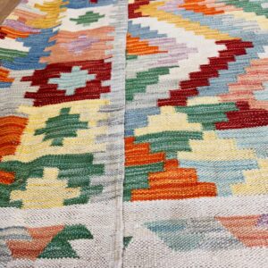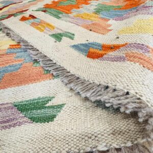 This vibrant Afghan handmade Kilim rug exemplifies the finest traditional craftsmanship. Handwoven from high-quality wool, it offers a durable and textured finish. The Kilim rug features an intricate design with a lively palette of multi-colour hues, blending bold patterns with striking tones. Perfect for adding a touch of cultural richness and unique style to any space, this rug not only enhances your décor but also embodies the rich artistic heritage of Afghan weavers.