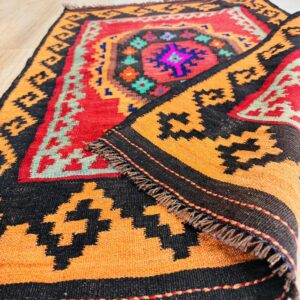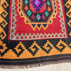 This vibrant Afghan handmade Kilim rug exemplifies the finest traditional craftsmanship. Handwoven from high-quality wool, it offers a durable and textured finish. The Kilim rug features an intricate design with a lively palette of multi-colour hues, blending bold patterns with striking tones. Perfect for adding a touch of cultural richness and unique style to any space, this rug not only enhances your décor but also embodies the rich artistic heritage of Afghan weavers.