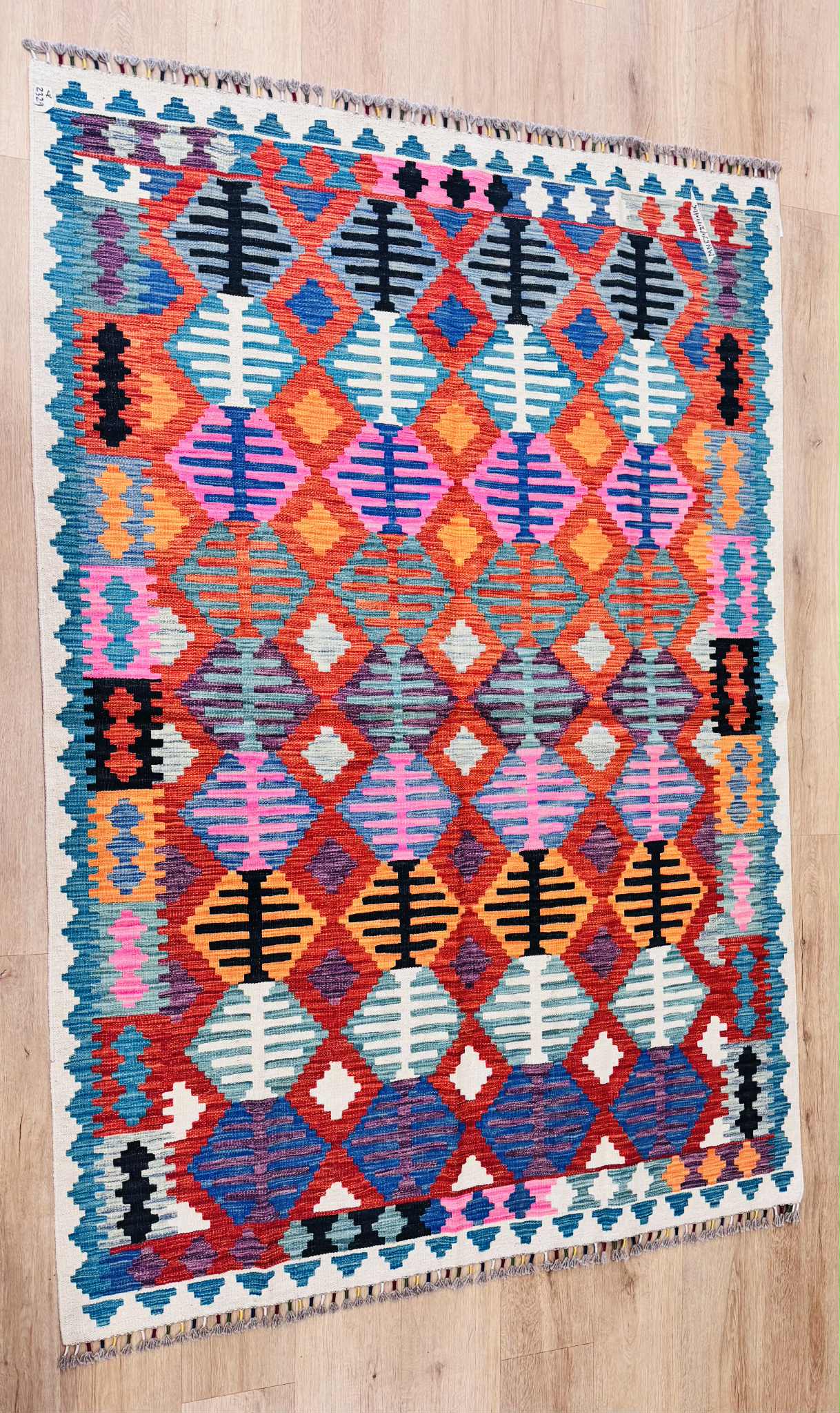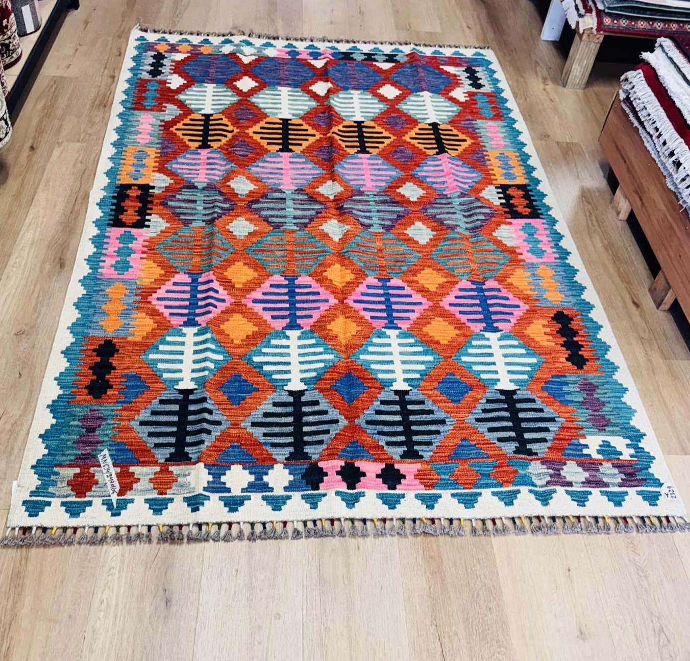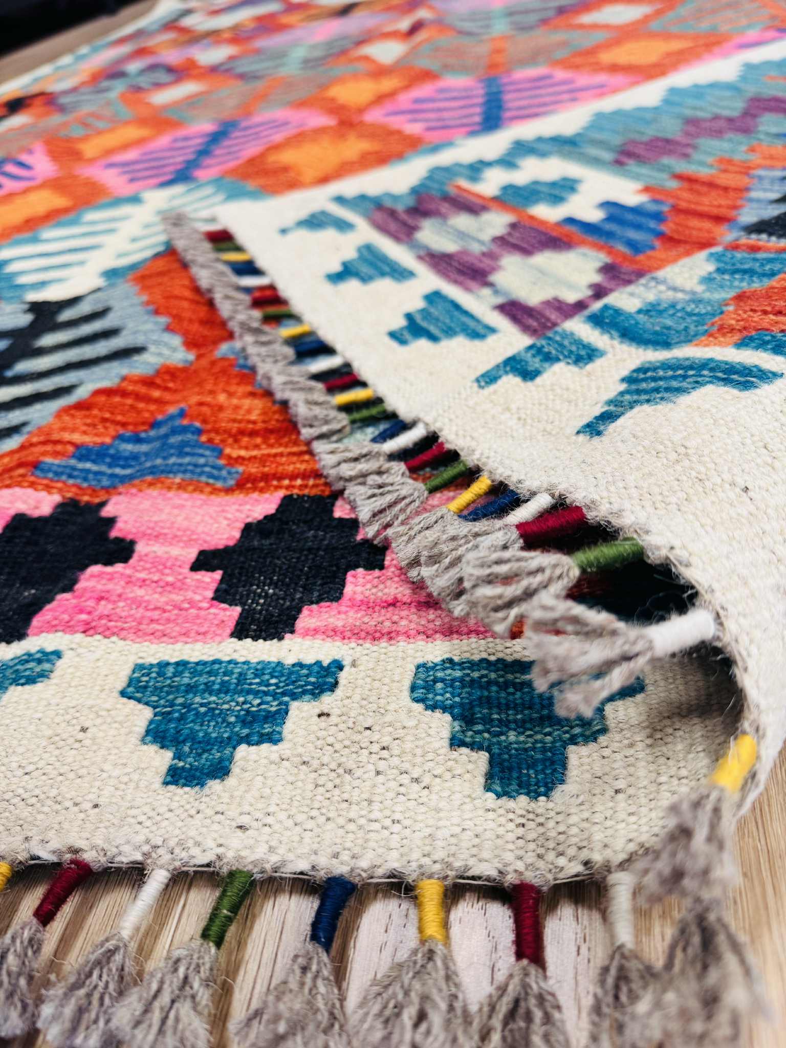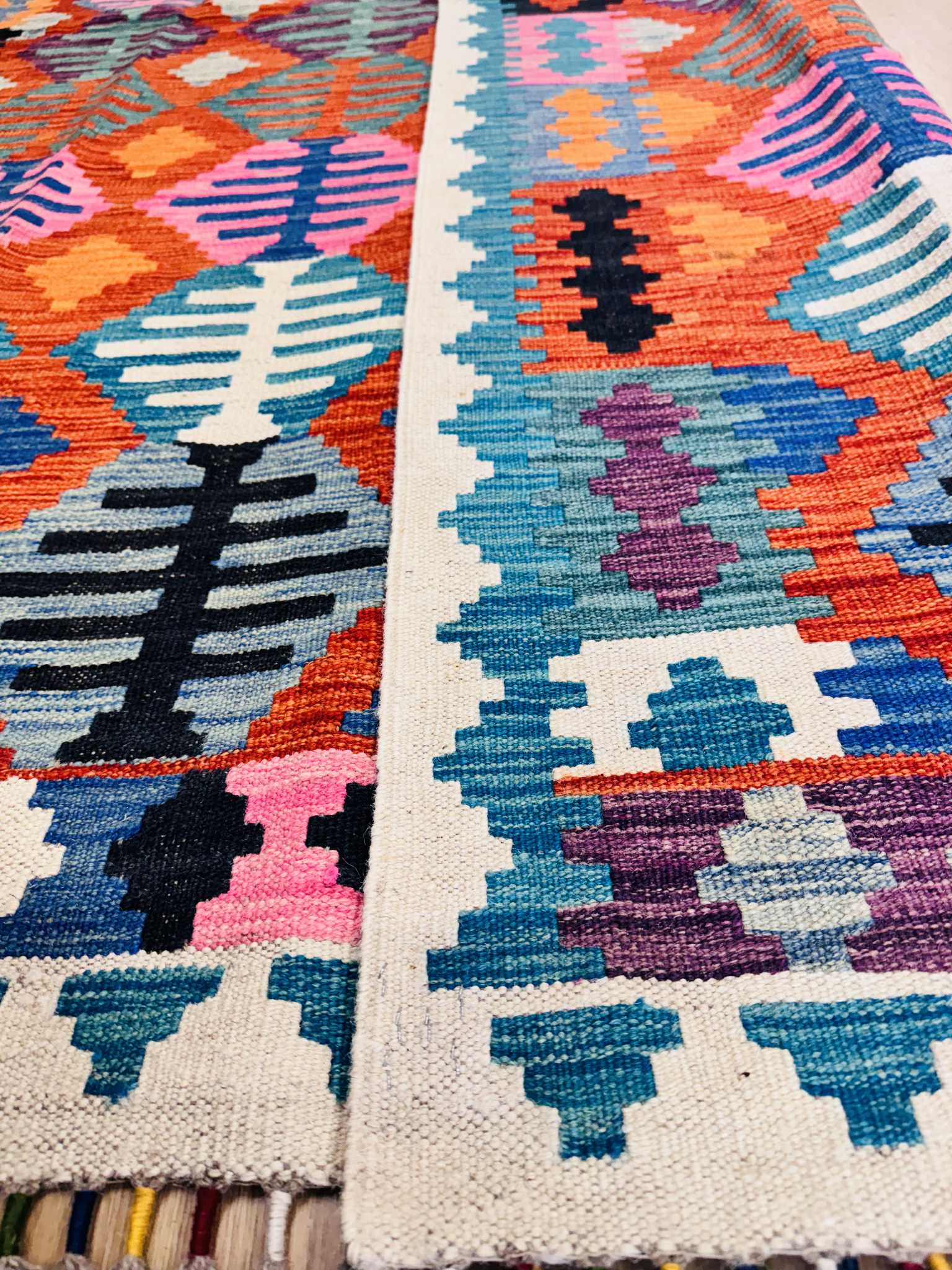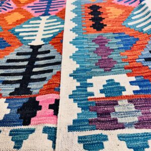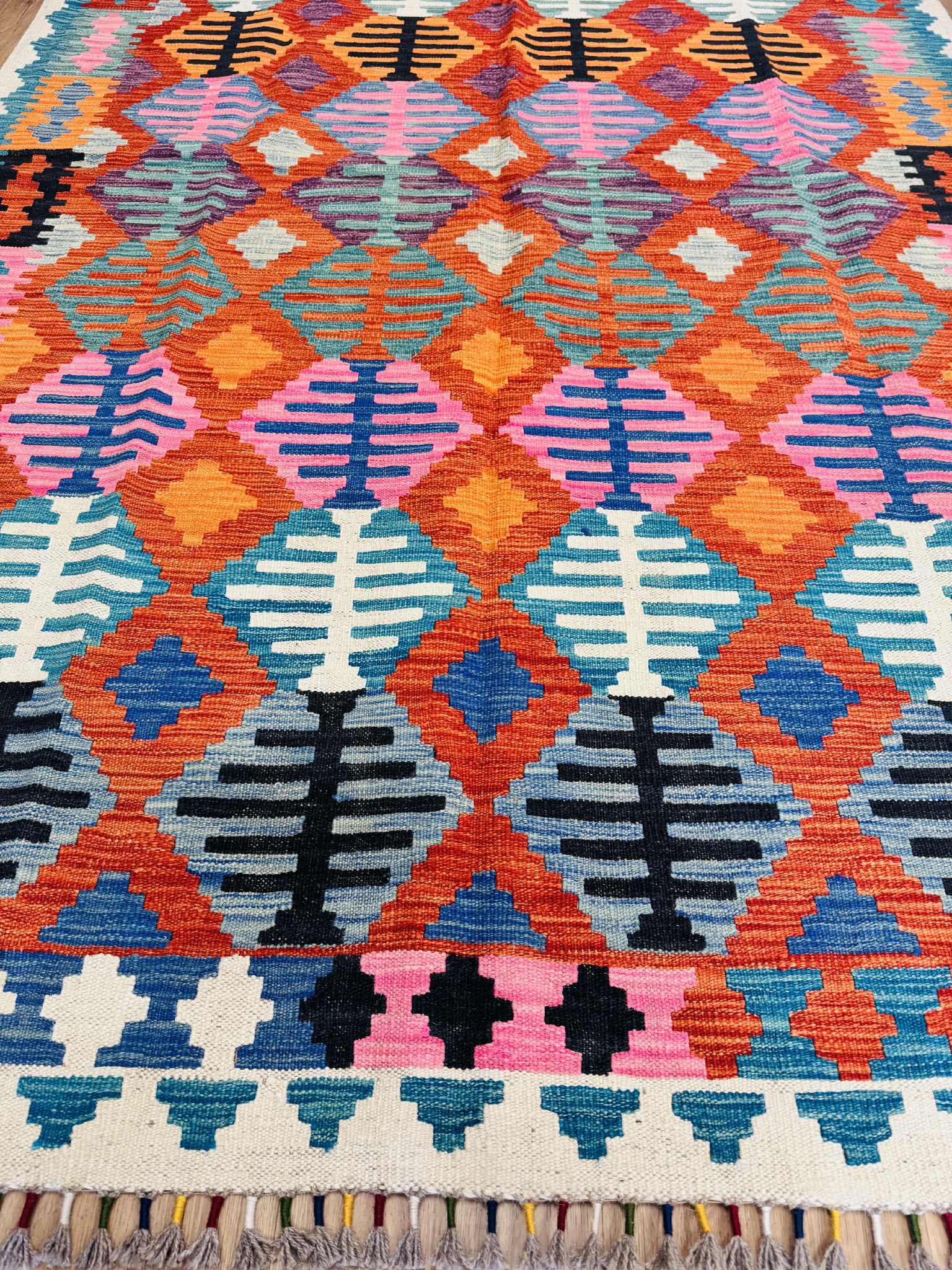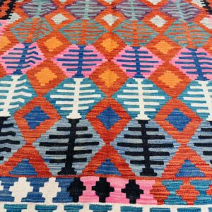 This vibrant Afghan handmade Kilim rug, exemplifies the finest traditional craftsmanship. Handwoven from high-quality wool, it offers a durable and textured finish. The Kilim rug features an intricate design with a lively palette of multi-colour hues, blending bold patterns with striking tones. Perfect for adding a touch of cultural richness and unique style to any space, this rug not only enhances your décor but also embodies the rich artistic heritage of Afghan weavers.