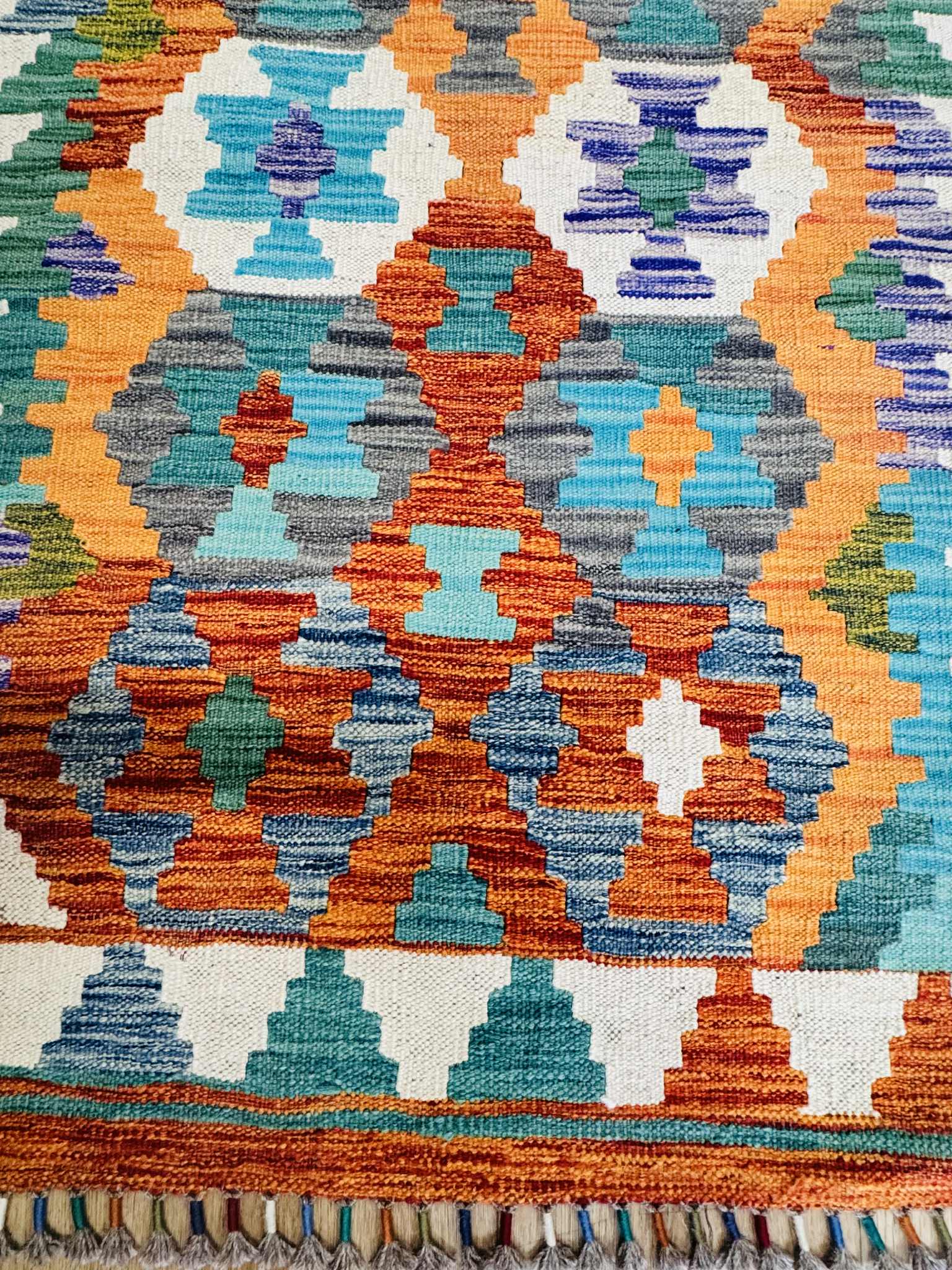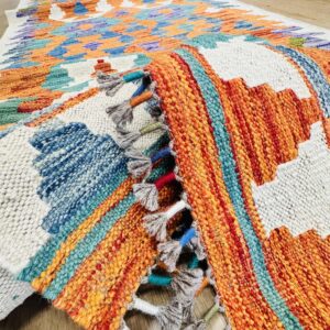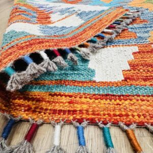 This vibrant Afghan handmade Kilim rug, exemplifies the finest traditional craftsmanship. Handwoven from high-quality wool, it offers a durable and textured finish. The Kilim rug features an intricate design with a lively palette of multi-colour hues, blending bold patterns with striking tones. Perfect for adding a touch of cultural richness and unique style to any space, this rug not only enhances your décor but also embodies the rich artistic heritage of Afghan weavers.