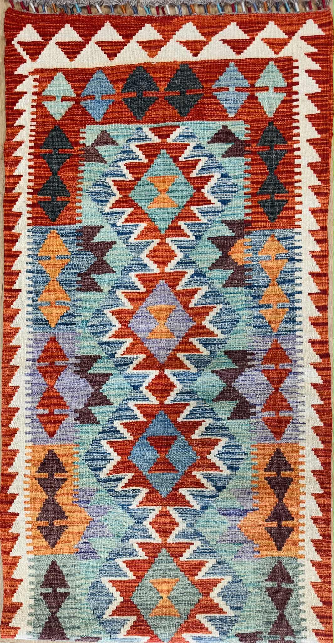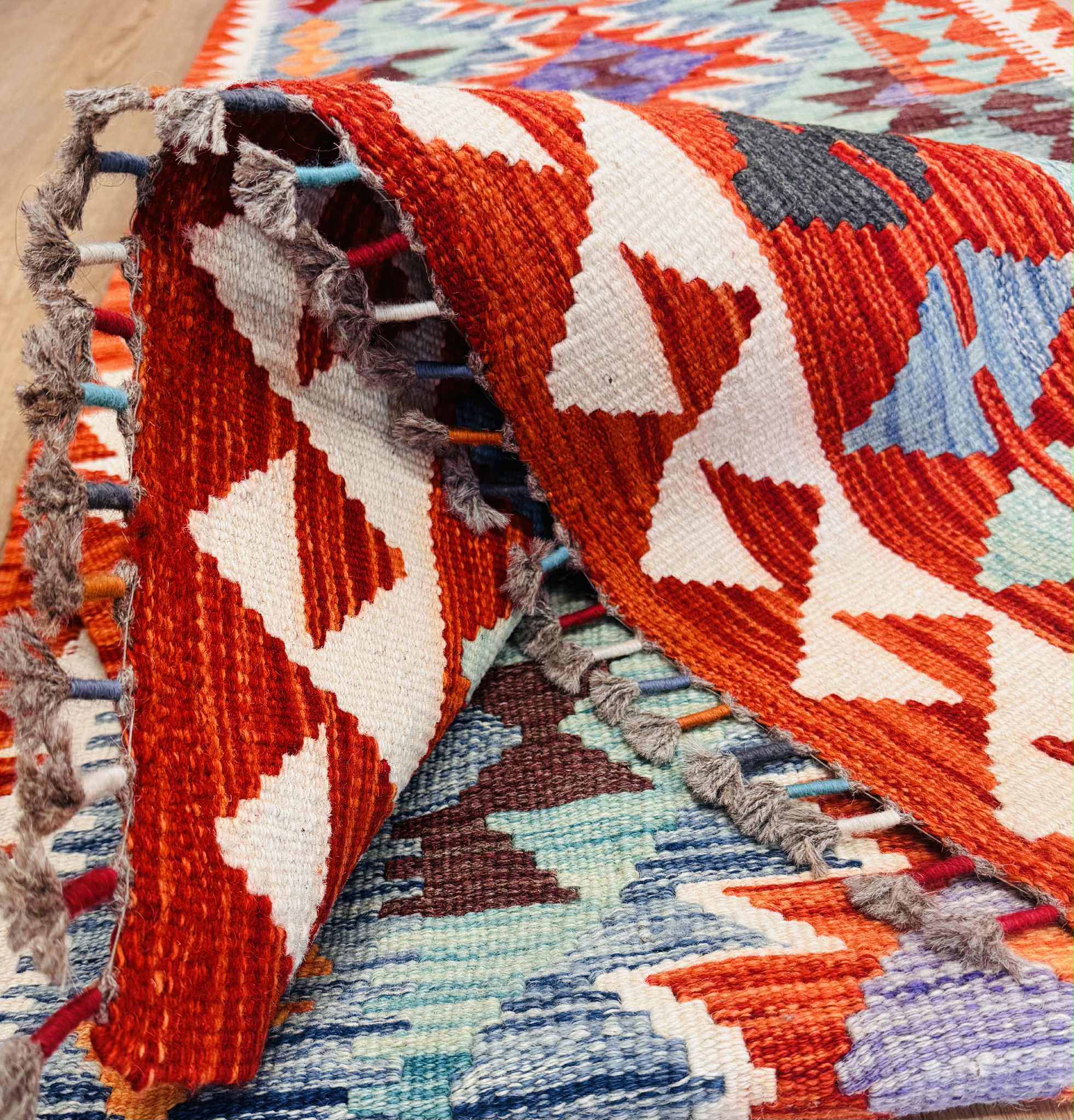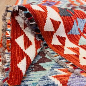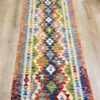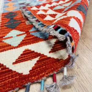 This vibrant Afghan handmade Kilim rug, exemplifies the finest traditional craftsmanship. Handwoven from high-quality wool, it offers a durable and textured finish. The Kilim rug features an intricate design with a lively palette of multi-colour hues, blending bold patterns with striking tones. Perfect for adding a touch of cultural richness and unique style to any space, this rug not only enhances your décor but also embodies the rich artistic heritage of Afghan weavers.