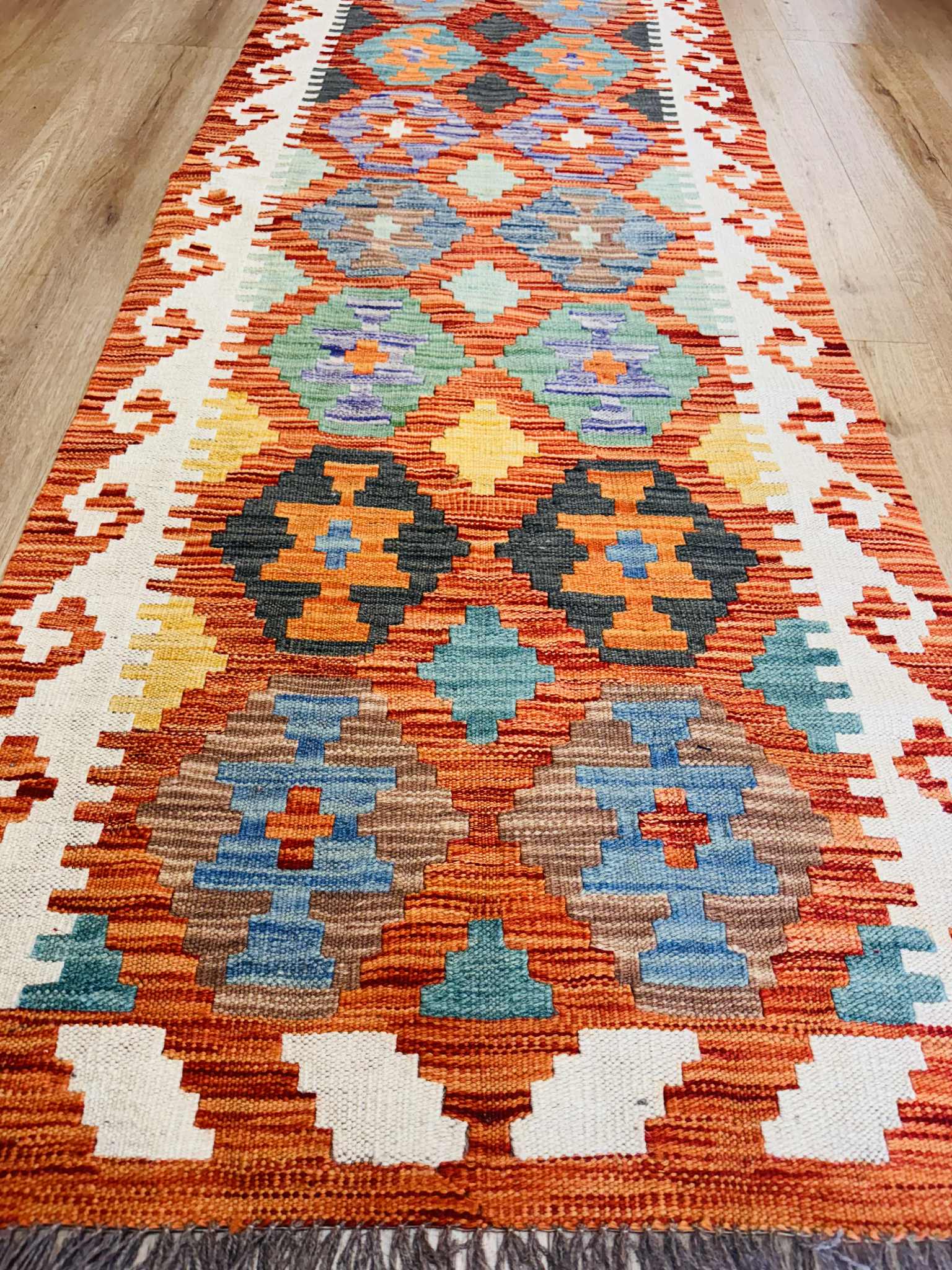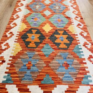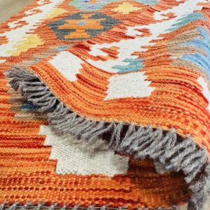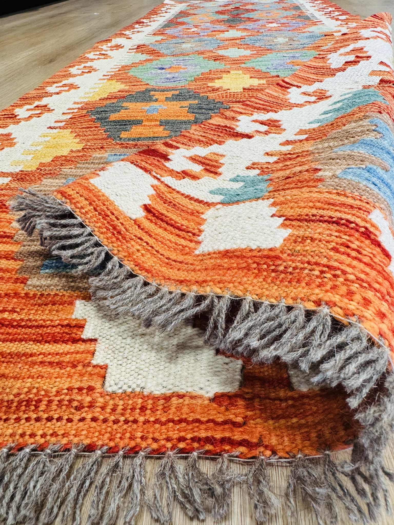 This vibrant Afghan handmade Kilim rug, exemplifies the finest traditional craftsmanship. Handwoven from high-quality wool, it offers a durable and textured finish. The Kilim rug features an intricate design with a lively palette of multi-colour hues, blending bold patterns with striking tones. Perfect for adding a touch of cultural richness and unique style to any space, this rug not only enhances your décor but also embodies the rich artistic heritage of Afghan weavers.