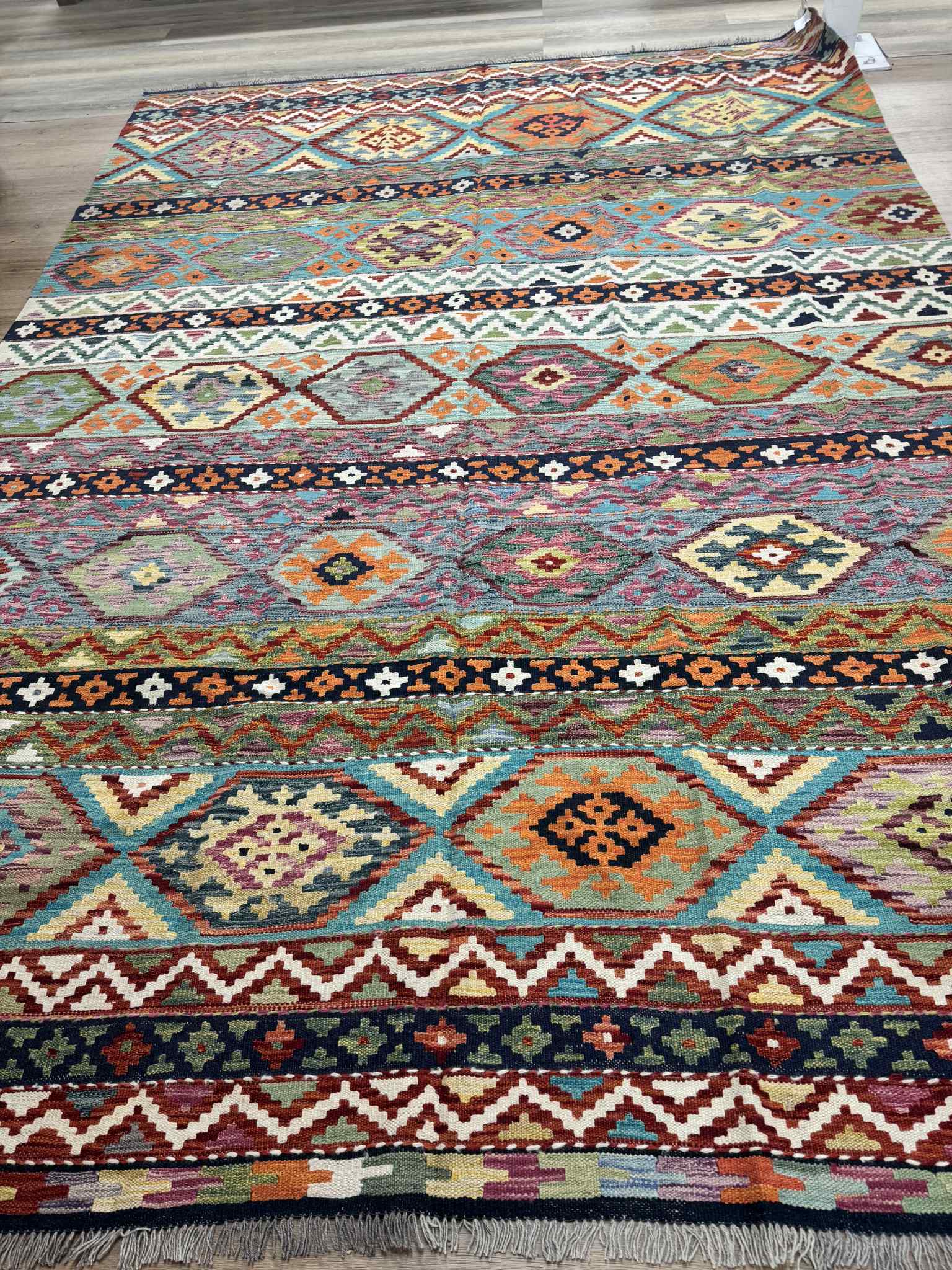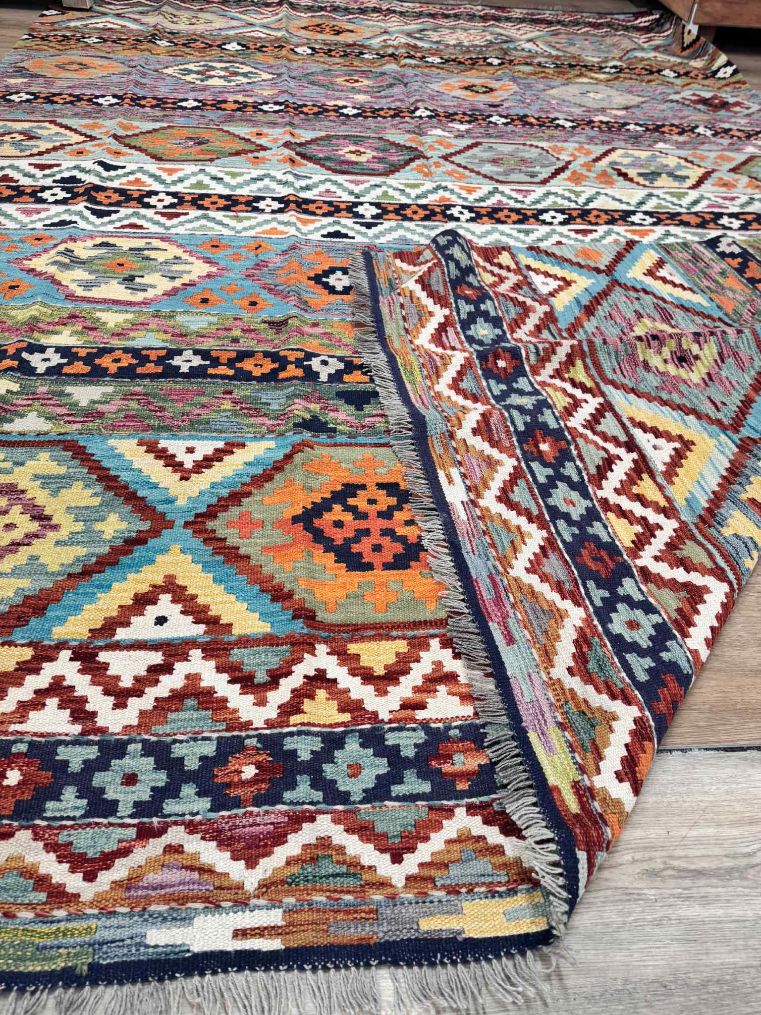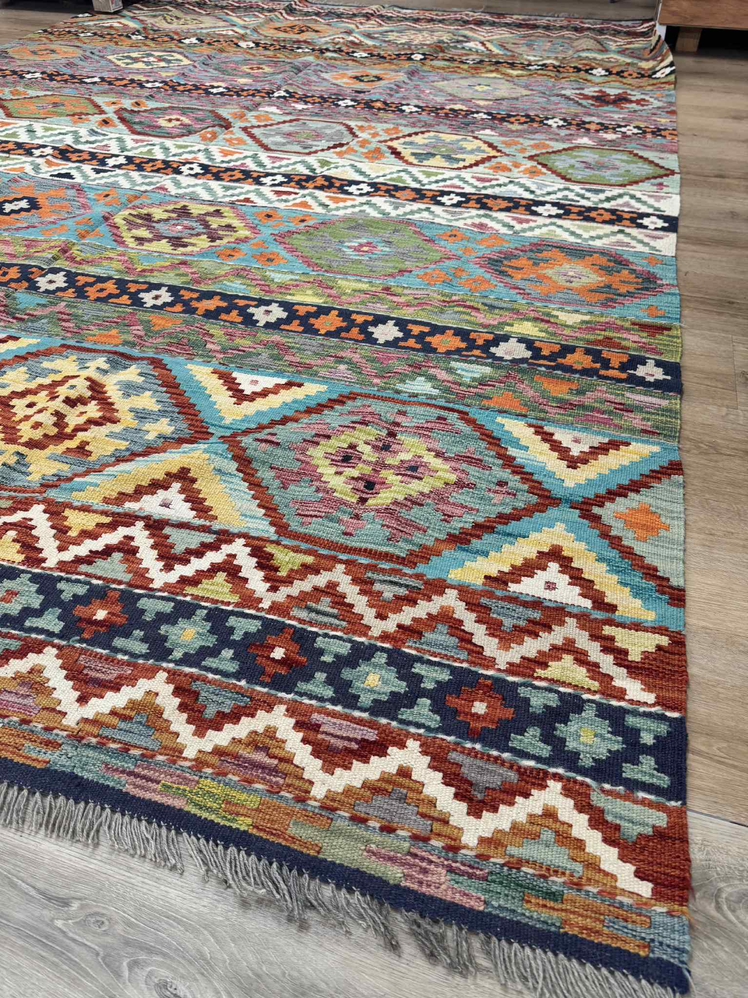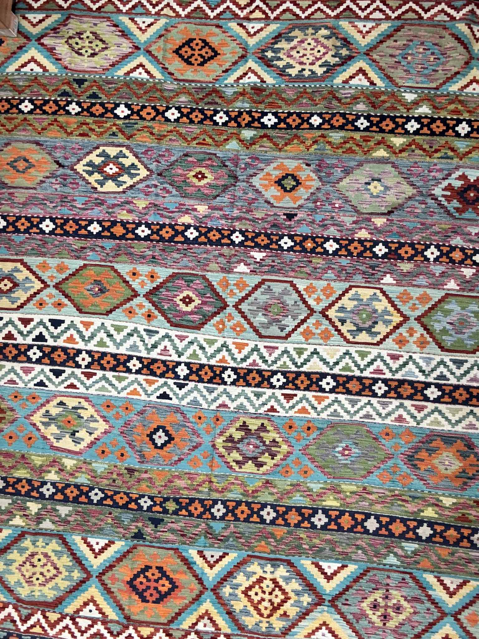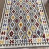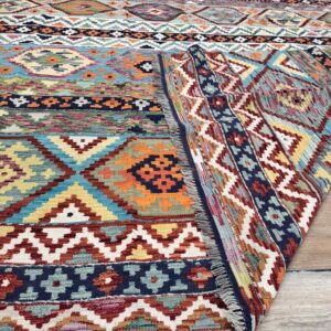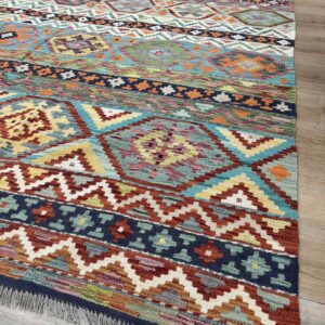This vibrant Afghan handmade Kilim rug, exemplifies the finest traditional craftsmanship. Handwoven from high-quality wool, it offers a durable and textured finish. The Kilim rug features an intricate design with a lively palette of multi-colour hues, blending bold patterns with striking tones. Perfect for adding a touch of cultural richness and unique style to any space, this rug not only enhances your décor but also embodies the rich artistic heritage of Afghan weavers.
