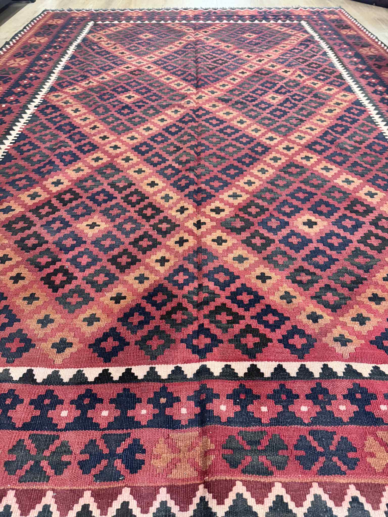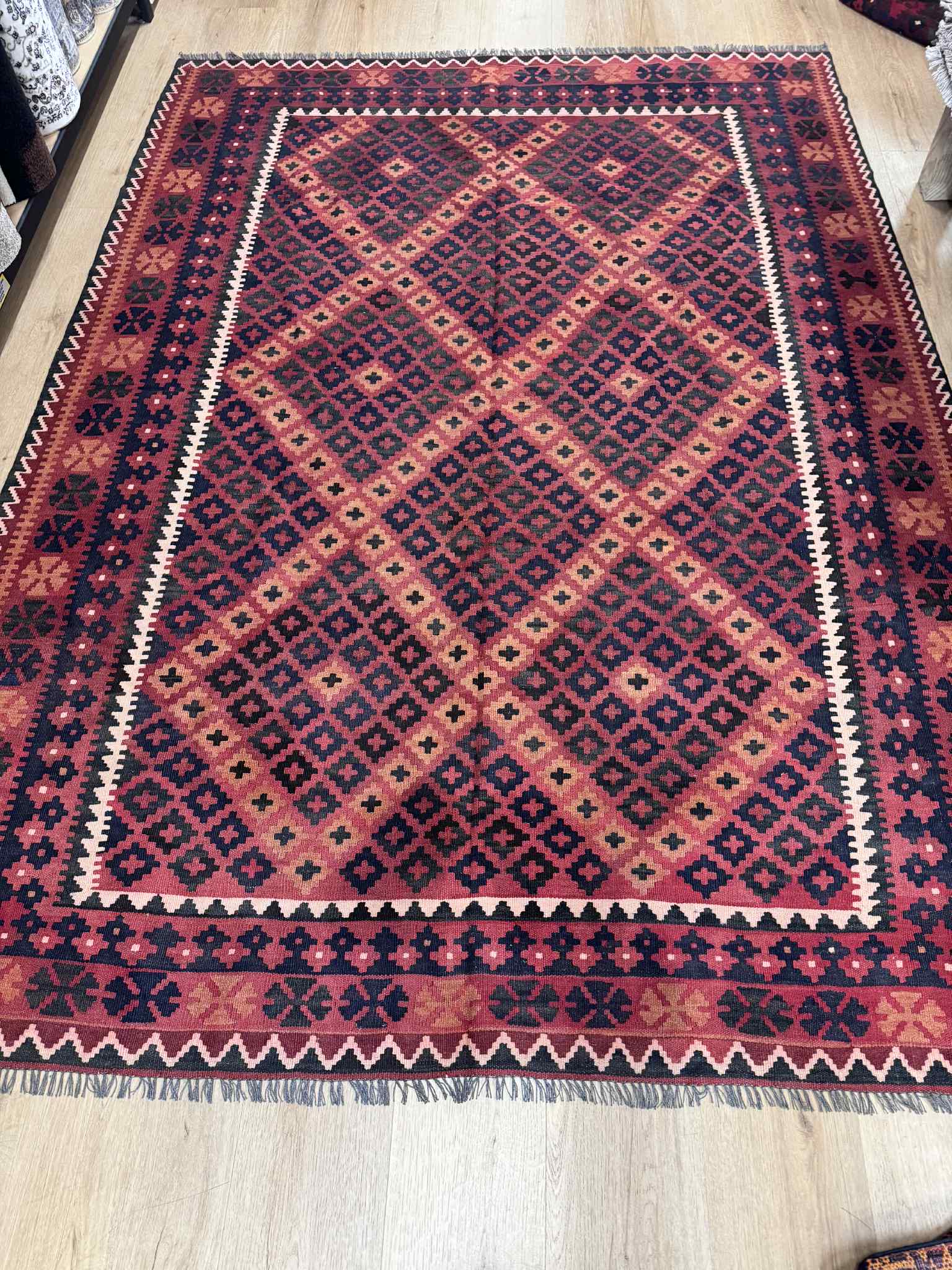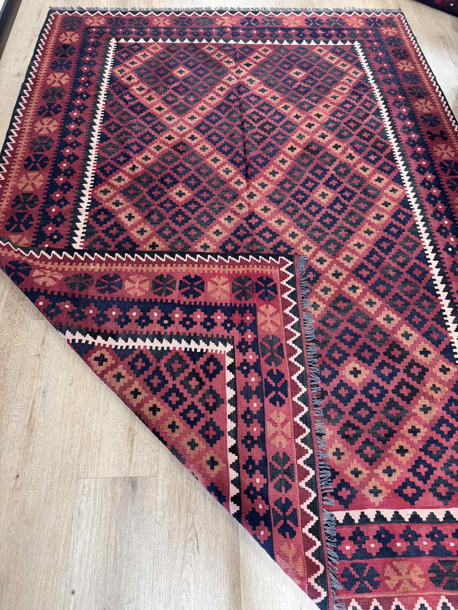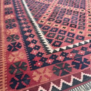This vibrant Afghan handmade Kilim rug, exemplifies the finest traditional craftsmanship. Handwoven from high-quality wool, it offers a durable and textured finish. The Kilim rug features an intricate design with a lively palette of multi-colour hues, blending bold patterns with striking tones. Perfect for adding a touch of cultural richness and unique style to any space, this rug not only enhances your décor but also embodies the rich artistic heritage of Afghan weavers.
