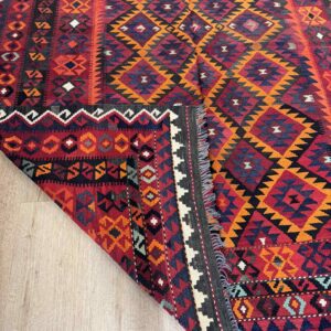 This vibrant Afghan handmade Kilim rug, exemplifies the finest traditional craftsmanship. Handwoven from high-quality wool, it offers a durable and textured finish. The Kilim rug features an intricate design with a lively palette of multi-colour hues, blending bold patterns with striking tones. Perfect for adding a touch of cultural richness and unique style to any space, this rug not only enhances your décor but also embodies the rich artistic heritage of Afghan weavers.