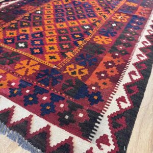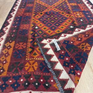 This vibrant Afghan handmade Kilim rug, exemplifies the finest traditional craftsmanship. Handwoven from high-quality wool, it offers a durable and textured finish. The Kilim rug features an intricate design with a lively palette of multi-colour hues, blending bold patterns with striking tones. Perfect for adding a touch of cultural richness and unique style to any space, this rug not only enhances your décor but also embodies the rich artistic heritage of Afghan weavers.