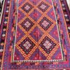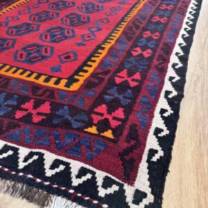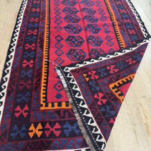 This vibrant Afghan handmade Kilim rug, exemplifies the finest traditional craftsmanship. Handwoven from high-quality wool, it offers a durable and textured finish. The Kilim rug features an intricate design with a lively palette of multi-colour hues, blending bold patterns with striking tones. Perfect for adding a touch of cultural richness and unique style to any space, this rug not only enhances your décor but also embodies the rich artistic heritage of Afghan weavers.